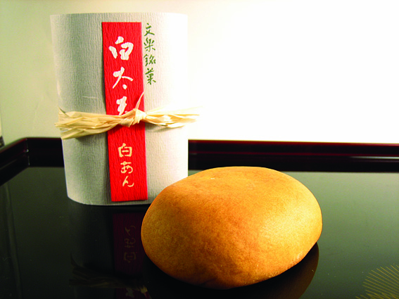 小豆あん入りのもなかです。香ばしく焼き上げた皮には、文楽の太棹三味線のバチをかたどりました。